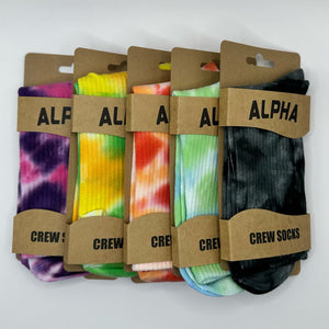 ALPHA Tie-Dye unisex Crew Socks is the perfect fusion of comfort, style, and durability. Crafted from a blend of premium cotton and polyester, these socks are designed to elevate your everyday wear with their vibrant tie-dye patterns.
